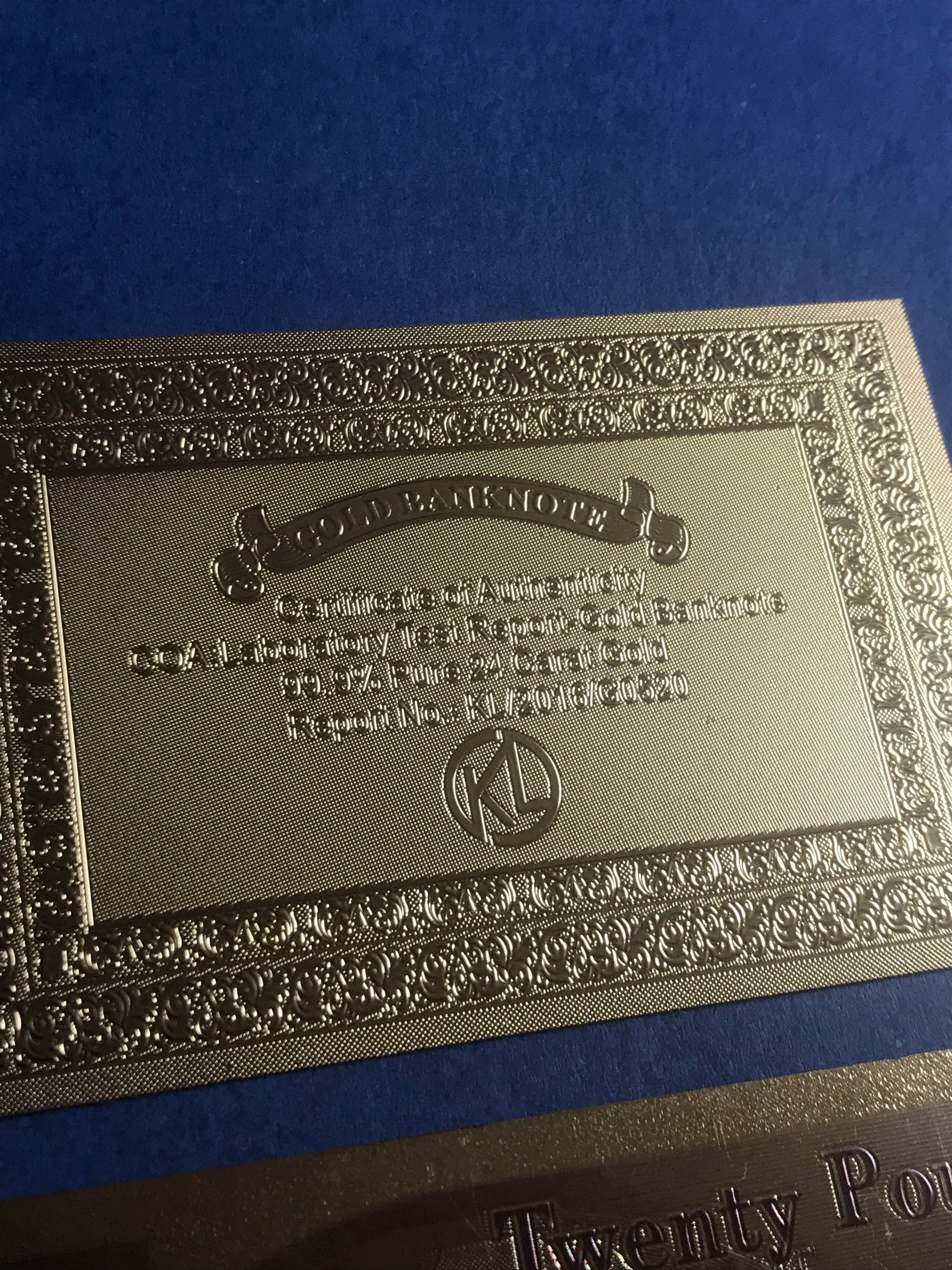 Genuine £20 gold foil note with certificate for collector souvenir art 24k gold